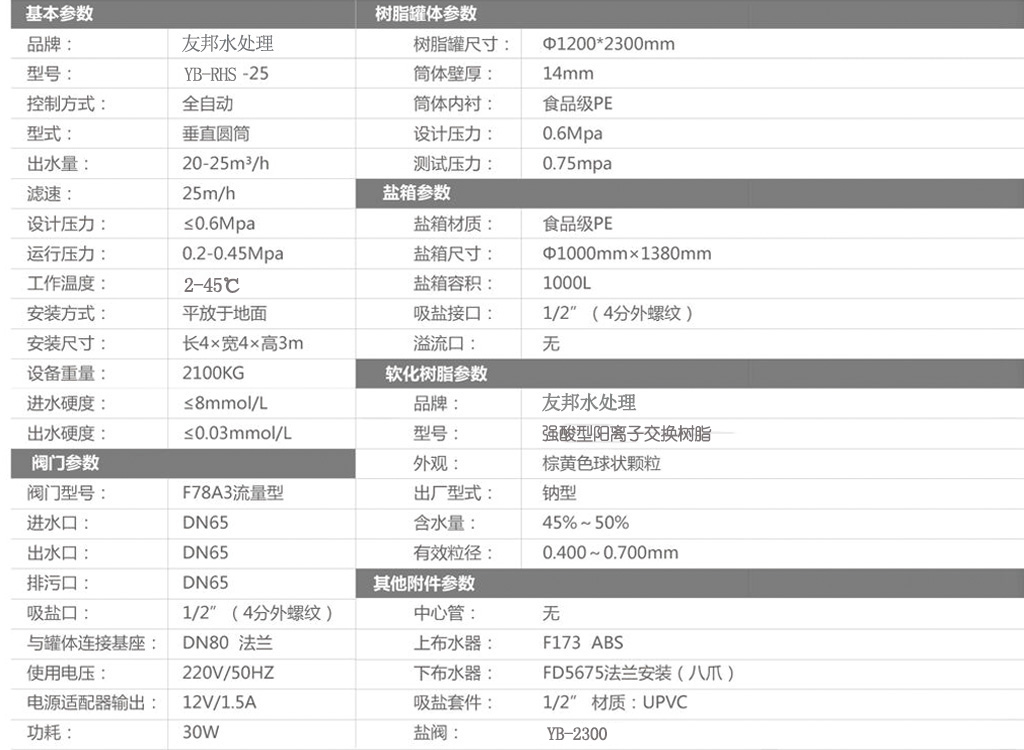 型號:YB-RHS-25,如需24小時連續出水選擇單罐單閥運行,默認樹脂罐體材質為玻璃鋼,如需特殊罐體請說明。