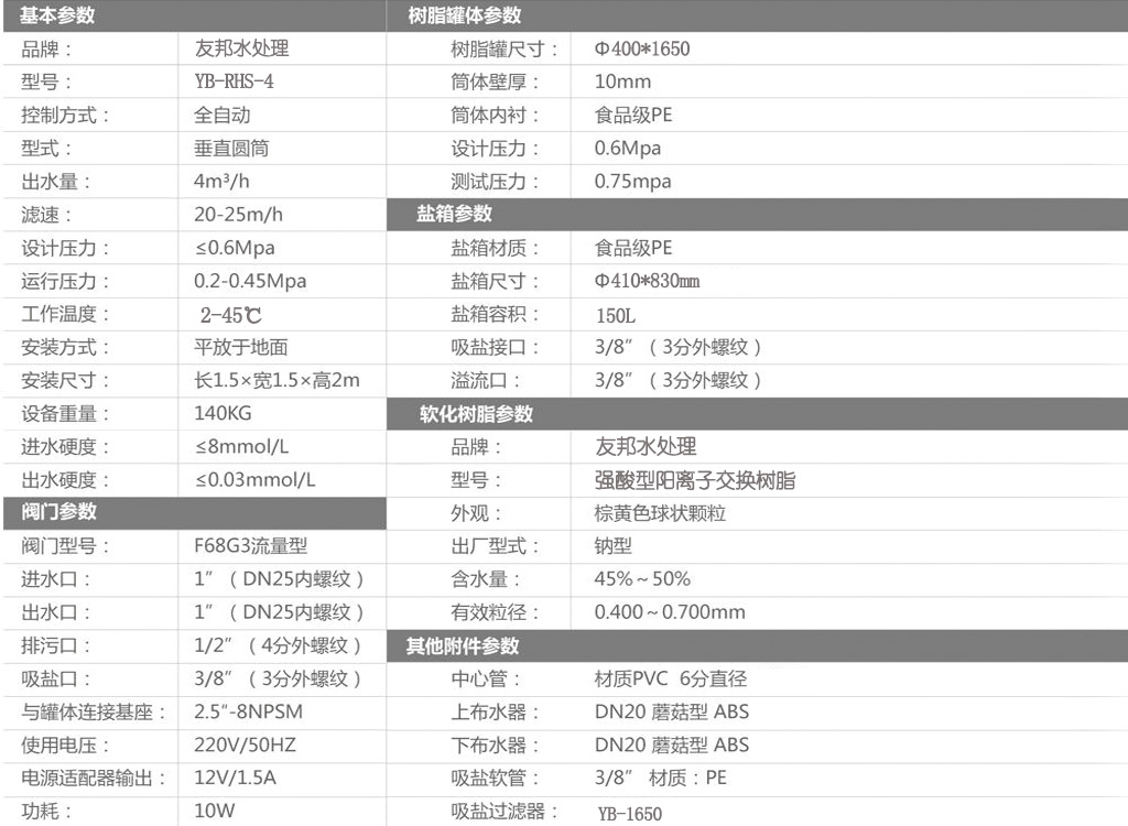型號(hào):YB-RHS-4,如需24小時(shí)連續(xù)出水選擇單罐單閥運(yùn)行,默認(rèn)樹(shù)脂罐體材質(zhì)為玻璃鋼,如需特殊罐體請(qǐng)說(shuō)明。