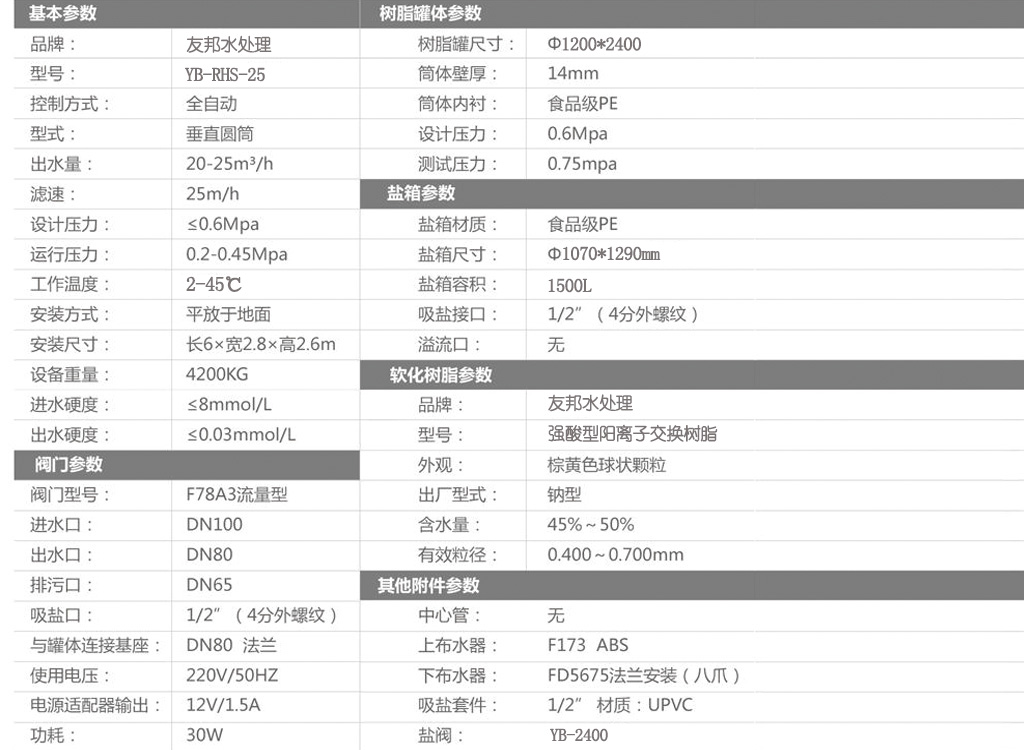 型號:YB-RHS-25,如需24小時連續出水選擇雙罐雙閥并聯運行,默認樹脂罐體材質為玻璃鋼,如需特殊罐體請說明。
