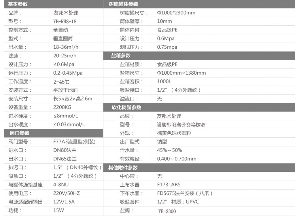 型號:YB-RHS-18,如需24小時連續出水選擇雙罐雙閥并聯運行,默認樹脂罐體材質為玻璃鋼,如需特殊罐體請說明。
