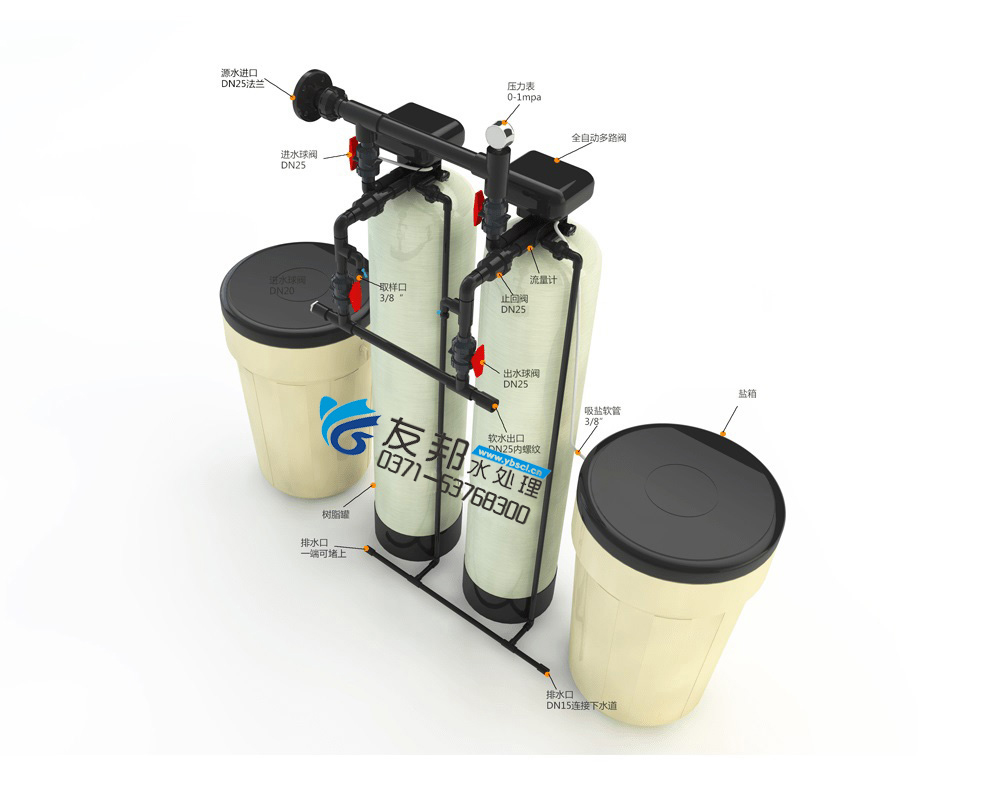 型號:YB-RHS-3,如需24小時連續出水選擇雙罐雙閥并聯運行,默認樹脂罐體材質為玻璃鋼,如需特殊罐體請說明。